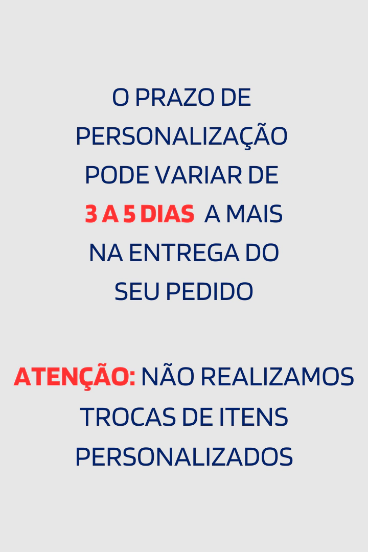 CONSIDERAR ATÉ 5 DIAS A MAIS NO PRAZO DE ENTREGA NO SEU PEDIDO QUE CONTENHAM ITENS PERSONALIZADOS.